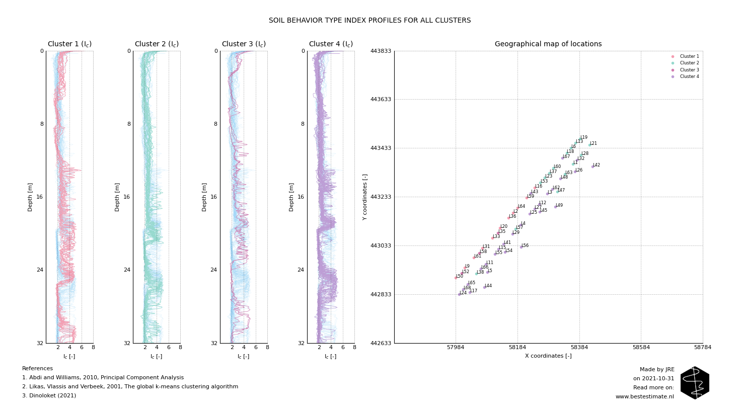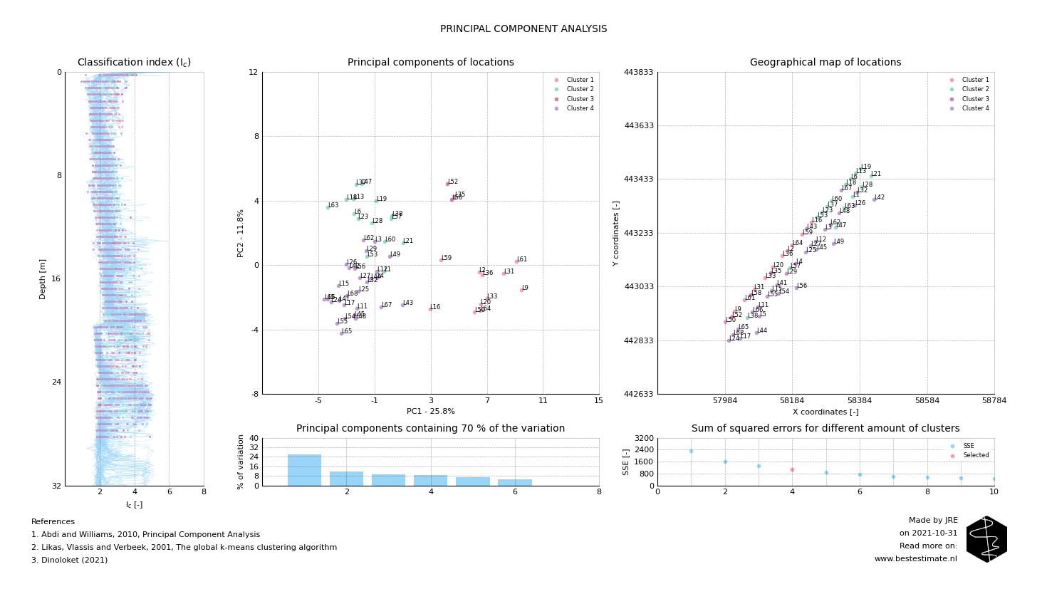Principal Component Analysis (PCA) is a relatively old technique in data science. It is a dimensionality reduction algorithm. In short it allows comparison of relatively complex measurements (like CPT tests) in an easy visual format. As a consequence easy comparison results in easy clustering.