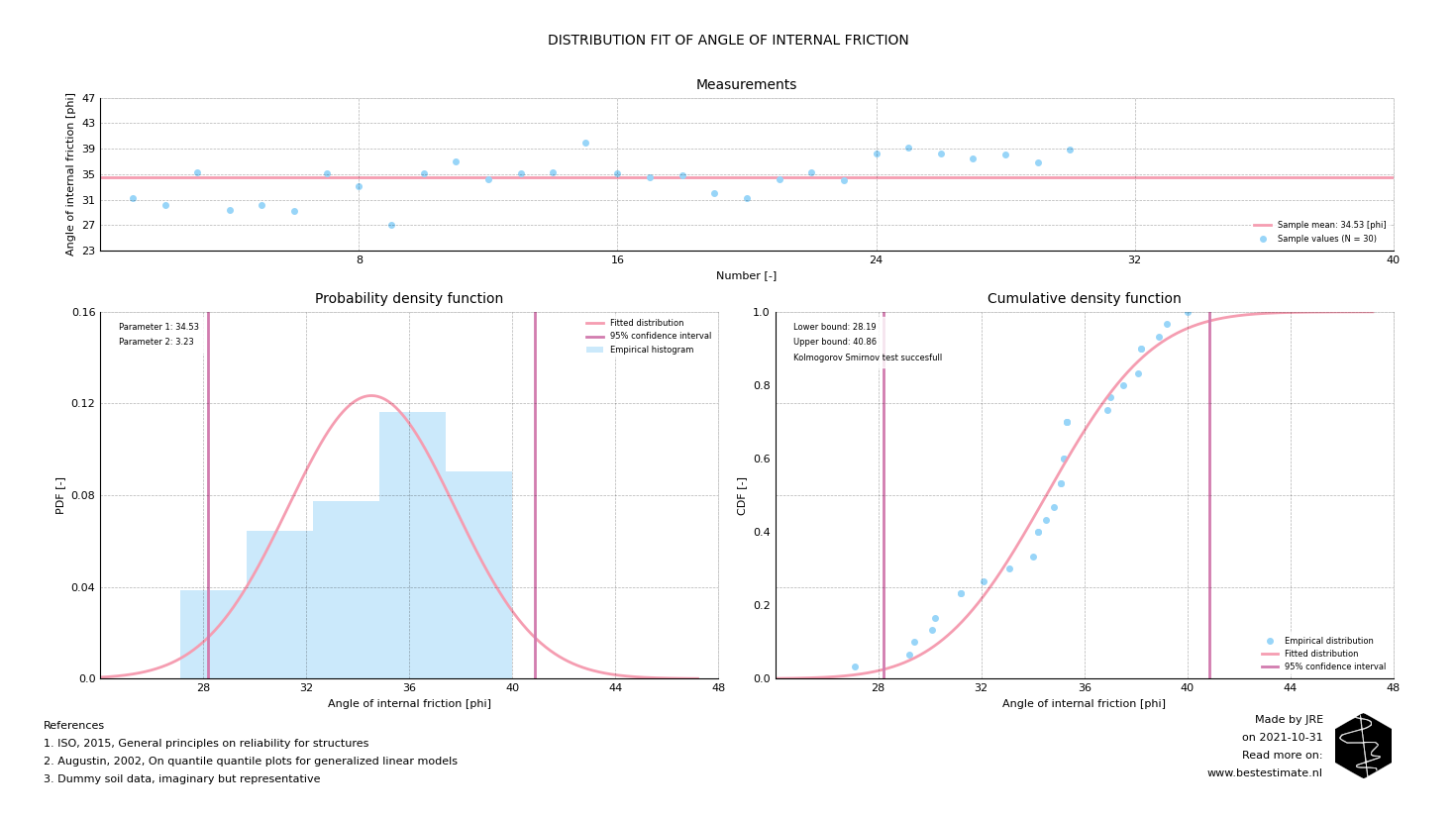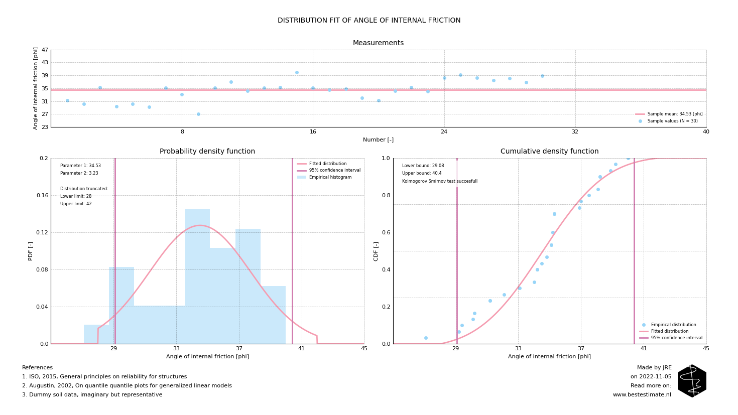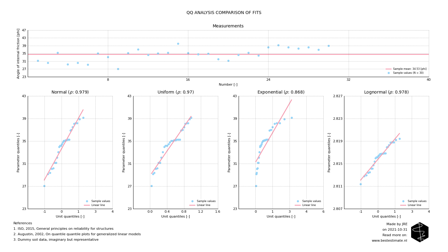 Fitting a probability density function allows everone to theoretically describe the variability of a parameter that is measured multiple times. Contrary to looking at the mean, it includes the amount and type of variation of the data. This allows for objectively estimating upper and lower bounds based on a pre-defined safety level. These analyses are often forgotten in practice and if used, performed in an over-simplified and incorrect manner. One step often misses: determining which type of distribution fits best. Figure 2 shows a Quantile-Quantile (QQ) analysis of 30 measurements of the angle of internal friction (describing the shear strength of sand). The closer the dots are to the 'unit line' the better the fit of the distribution.