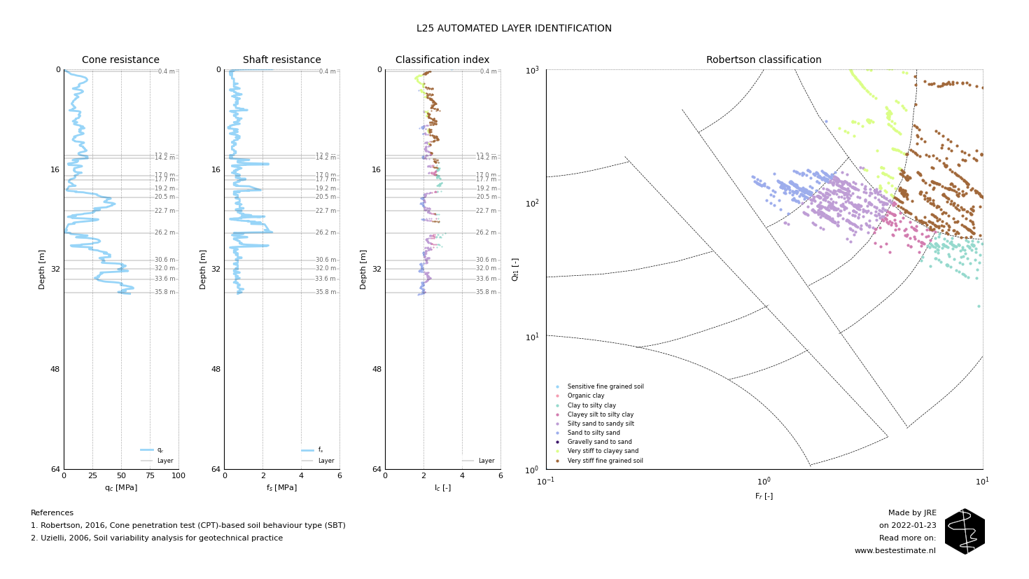 In this example soil properties over depth are evaluated. It is therefore required that different data series are constructed for each different layer. In order to do this the layer identification algorithm has been improved. This has been done by automatic merging layers based on a Welch-t tests performed between them. The figure below shows an example of the performance of this updated algorithm. As always it is possible to manually adapt the layers since engineering judgement should never be eliminated from these kind of analyses.