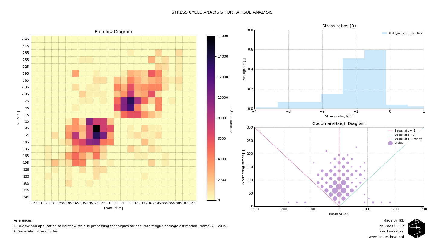Since there are cycles with non-zero means, it will be difficult to use standard S-N curves (which will be discussed in the next blog). That Is why corrections need to occur for all cycles with a stress ratio, which is the maximum stress in the cycle divided by the minimum. All non-zero stresses have to be converted to stress cycles with a zero mean. This is achieved with the Goodman-Haigh diagram displayed in the bottom right. Again, this blog will not go into depth, but it is essential to perform this correction as it ensures that: